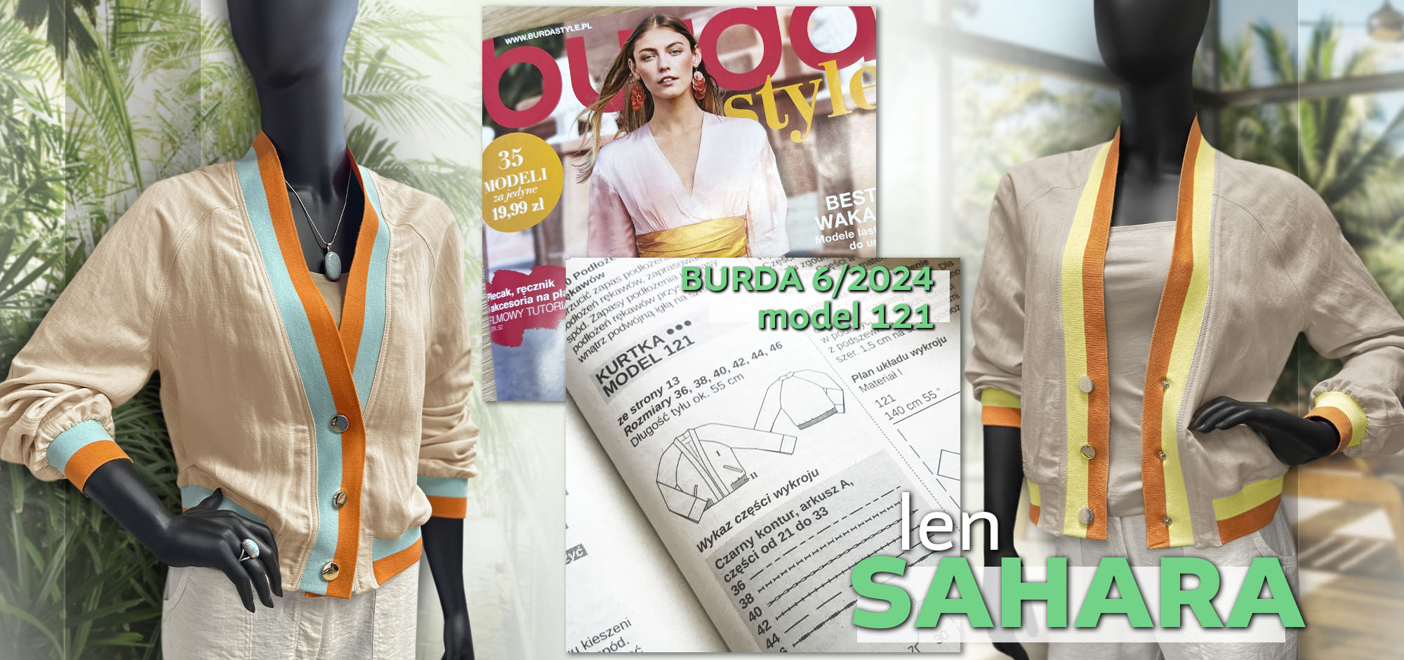 Len Sahara to naturalna tkanina wykonana z połączonych ze sobą włókien lnu oraz wiskozy. Posiada unikatową fakturę, w której diagonalny splot łączy się z charakterytycznymi dla tkanin lnianych grubszymi nitkami. Tkanina jest bardzo przyjemna w chwycie, miękka, układa się lejąco. To świetna propozycja nie tylko na sukienki i bluzki, lecz także na lekkie okrycia wierzchnie, np. bomberki.